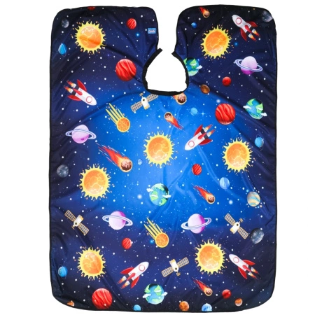 - Kolorowy, przyjazny wzór – pełen planet, rakiet i słońc, aby dzieci czuły się swobodnie i dobrze bawiły się podczas strzyżenia.
